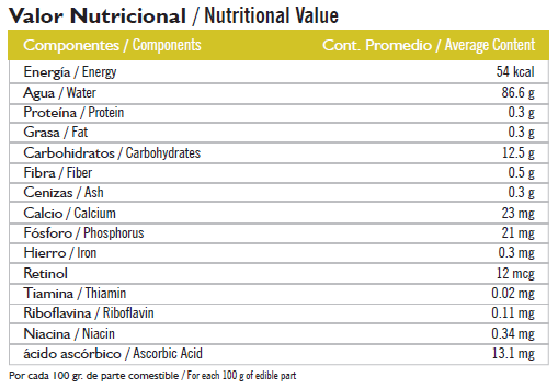 O yacon tem um baixo valor calórico, pois existe um elevado teor em água. Mas cerca de 60% dos carboidratos presentes (7,5g em 100g) são frutoligosacarídeos, uma substância raríssima nos alimentos naturais. É esta substância que torna o Yacon um produto único e especial na alimentação das pessoas que sofrem de diabetes.